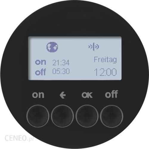 R.x/Serie 1930/Glas KNX RF quicklink Łącznik czasowy Berker.Net, czarny, połysk Berker 85745231FunkcjePrzesunięcie czasu astronomicznego:± 2 hRezerwa zasilania:≈ 24 hGenerator losowy:± 15 mnfunkcje dodatkowe ETS: +6 scen, tryb pracy wł./wył., sterowane czasowo wywoływanie scen i wartości ściemniania, łącznik przyciskowy, wskaźnik stanu funkcja resetu (do ustawień fabrycznych) możliwość konfiguracji funkcji nadajnika i/lub odbiornika funkcja „przyjęcie”, polecenia automatyczne, radiowe i polecenia rozszerzeń nie są wykonywane (blokada przełączenia) z blokadą przycisków ; funkcje quicklink: przełączanie, 2 sceny, sterowanie czasowe, łącznik przyciskowy (zestyk zwierny), sterowanie wymuszone przełączanie tryb ręczny/automatyczny Elementy sterujące i wskaźnikiwyświetlacz LCD podświetlany podczas obsługi wskazywanie kompatybilności nasadki/mechanizmu na wyświetlaczu regulowany kontrast wyświetlacza LCD PołączeniaProtokół radiowy:KNXCzęstotliwośćCzęstotliwość nadajnika/odbiornika radiowego:868,3 MHzMocMoc nadajnika radiowego:< 10 mWPomiaryWilgotność względna (bez skroplin):0 … 65 % (bez kondensacji)Dokładność chodu:± 3 min/rokMateriałkolor linii dekoracyjnej:antracyt aksamitPowierzchnia:połyskWymiaryśrednica:58 mmPodłączenieintegracja z systemem KNX-TP poprzez sieć radiową KNX/bramkę natynkową TP Ustawieniaz automatycznym przełączaniem czas zimowy/czas letni (możliwość odłączenia) program astronomiczny do przełączania przy wschodzie/zachodzie słońca z możliwością wprowadzenia miasta/kraju i indywidulnego dostosowania polecenia programów typu standalone przesyłane drogą radiową i z rozszerzeń nie są realizowane program urlopowy powodujący przypadkowy wybór czasów przełączania w trybie automatycznym WyposażenieLiczba kanałów radiowych:1Liczba połączeń quicklink:maks. 20 nadajników/odbiornikówLiczba czasów przełączenia wł./wył.:202 niezależne wstępnie ustawione pamięci z możliwością indywidualnego dostosowania BezpieczeństwoStopień ochrony:IP20Warunki użytkowaniaTemperatura robocza:-5 … 45 °Cniskie zapotrzebowanie na energię OznaczenieZastosowanie:Sterowanie oświetleniem, KNX radiowy – systemy obsługiGłówna linia projektowa:Berker R.1/R.3/Serie 1930/R.classic…