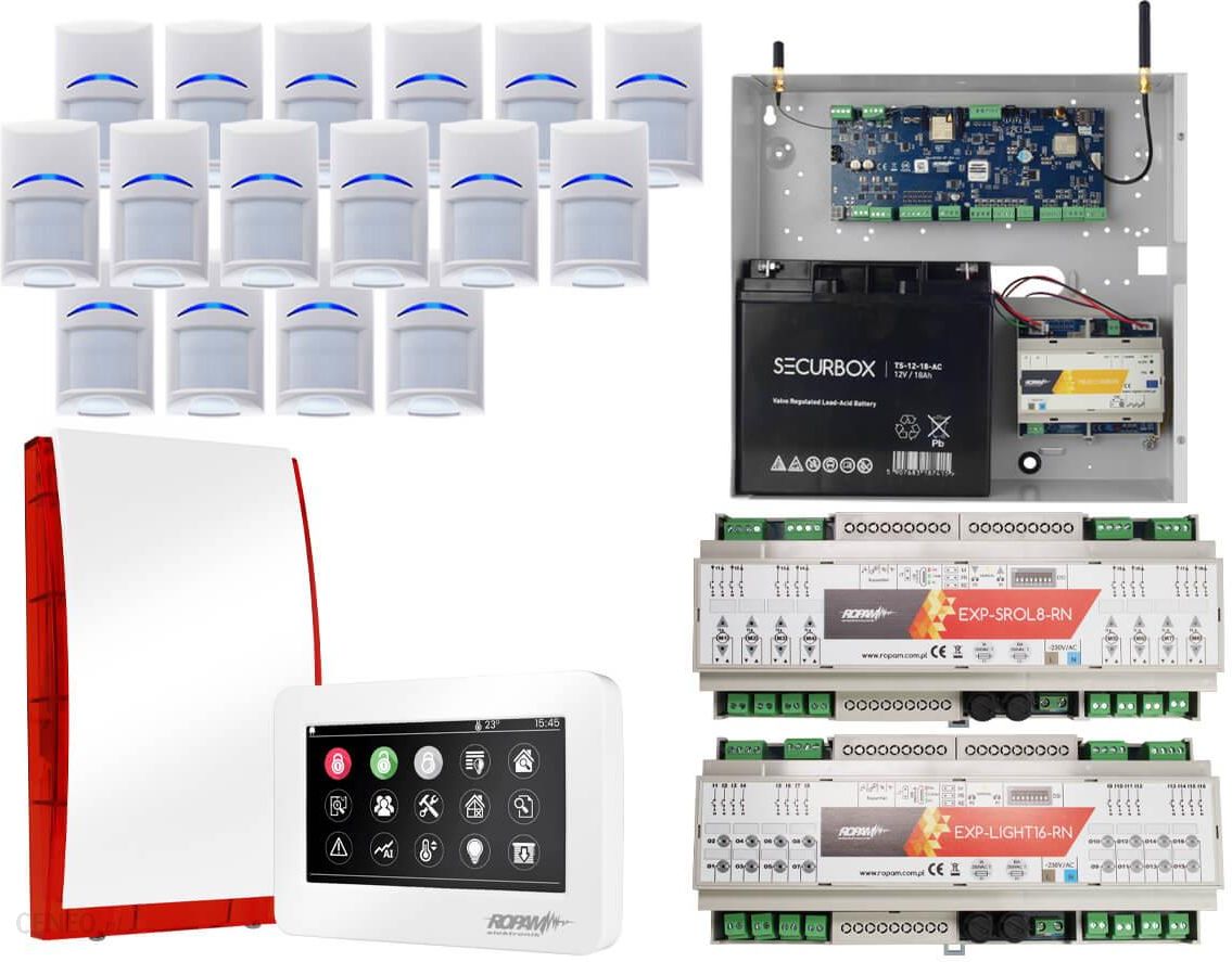 Alarm: Zestaw Ropam NeoGSM-IP-64-SET + Manipulator TPR-4WS + 16x Czujka Bosch ISC-BPR2-W12 + akcesoriaSzukasz systemu alarmowego do swojej posesji i interesuja Cię bezkompromisowe rozwiązania? Powyższy zestaw z czujkami Bosch oraz automatyką domową pozwoli Ci skutecznie zabezpieczyć dom i zasymulować obecność lokatorów gdy nie będzie Cię w pobliżu.Posłużą do tego specjalne sterowniki do zautomatyzowania rolet okiennych i oświetlenia, których działanie możesz zaprogramować w harmonogramie centrali, ale również sterować poszczególnymi modułami ręcznie poprzez piloty, manipulatoy czy aplikację mobilną.Dodatkowo płyta główna NEOGSM-IP-64 posiada łączność Wifi oraz moduł powiadamiania GSM, więc co by się nie działo, zawsze będziesz na bieżąco z sytuacją, nawet podczas awarii prądu.Płyta Główna Ropam NeoGSM-IP-644 niezależne strefy z dwoma typami czuwania: pełne lub nocne,centrala hybrydowa: przewodowa + system bezprzewodowy Aero,użytkownicy: 32 kodów (1 główny +31), 8 numerów telefonów, e-mail,tworzenie listy użytkowników w programie NeoGSM-IP64 Manager,16-64 wejść programowalnych, rozbudowa przez ekspandery wejść, panele dotykowe,8-40 wyjść programowalnych, rozbudowa przez ekspandery wyjść, + obsługa do 32 modułów roletowych (magistralowe lub radiowe),obsługa do 4 paneli dotykowych (serii TPR-4x/4xS) lub klawiatur dotykowych (TK-4x),dodatkowe lokalne wyjście przekaźnikowe w każdym panelu dotykowym,wbudowany modem GSMwbudowany moduł WIFI (wraz z konektorem oraz anteną na obudowę)opcja połączenia przewodowego LAN poprzez ekspander: EXP-LAN,obsługa aplikacji mobilnej: RopamNeo, do nadzoru online przez internet,komunikacja IP: WIFI/LAN kanał podstawowy, GPRS kanał zapasowy (automatyczne przełączanie),4 timery z kalendarzem, do sterowania i automatyki,współpraca z zasilaczami PSR-ECO (oszczędność energii i kosztów),zaawansowane funkcje logiczne i programowe przekaźniki czasowe, LogicProcessor,programowanie lokalne przez micro USB lub WIFI/ETH,programowe zdalne przez serwer RopamBridge (GPRS lub IP),obsługa kodów USSD (kontrola kart pre-paid),wygodne rozłączne złącza zaciskowe, pogrupowane wg portów,2 magistrale RopamNET ( wbudowana diagnostyka magistrali),możliwość aktualizacji oprogramowania poprzez kabel USB lub WiFi.Sterownik EXP-SROL8-RNPrzewodowy sterownik rolet, żaluzji,Obsługa do 8 rolet, 8 silników 230VAC8 lokalnych wejść sterujących,Możliwość pracy autonomicznejZasilanie 230VAC (z magistrali RopamNET – tylko komunikacja)Praca systemowa (pod kontrolą centrali NeoGSMIP-64)Sterowanie lokalne (praca autonomiczna i systemowa)Sterowanie kątem pochylenia lameli w żaluzjach fasadowych (praca systemowa)Sterowanie zdalne (piloty, aplikacja mobilna, panele dotykowe – praca systemowa)Informacja o stopniu otwarcia rolety (%)Optyczna sygnalizacja pracyKompatybilność z NeoGSM-IP-64 (wymagane oprogramowanie centrali min. 1.6 oraz NoeoGSM-IP-64-Manager w wersji min. 1.6)Możliwość integracji z innymi systemami poprzez wejścia lokalneOchrona silnika przy uszkodzonym przekaźniku (amperometryka)Wysokiej jakości przekaźniki, wymienne w podstawkachMontaż na szynę DIN (szerokość 12 standardowych modułów)STEROWANIE ROLETAMIModuł rozszerzający do centrali NeoGSM-IP64 pozwala na podłączenie do 8 rolet, dzięki któremu zaimplementujesz automatykę okien na swojej posesji.Sterownik EXP-LIGHT16-RN:Przewodowy sterownik oświetleniaMożliwość sterownia każdym rodzajem oświetlenia zasilanego z sieci 230 VAC (świetlówki, żarówki, lampy LED itd.)16 wyjść16 lokalnych wejść sterującychMożliwość pracy autonomicznejPraca systemowa (pod kontrolą centrali NeoGSM-IP-64)Sterowanie lokalne (praca autonomiczna i systemowa)Możliwość konfiguracji dla lokalnych wejść osobnych zachowań dla krótkiego i długiego wciśnięcia (praca systemowa)Możliwość sterowania wyjściem z kilku wejść lokalnych (praca systemowa)Możliwość konfiguracji wyjścia jako mono lub bistabilne również przy sterowaniu lokalnym (praca systemowa)Możliwość sterowania z jednego wejścia lokalnego kilkoma wyjściami (praca systemowa)Sterowanie zdalne (piloty, aplikacja mobilna, panele dotykowe – praca systemowa)Kompatybilność z NeoGSM-IP-64Możliwość integracji z innymi systemami poprzez wejścia lokalneWysokiej jakości przekaźniki z wygodnym montażem ułatwiającym wymianęMontaż na szynę DIN (szerokość 12 standardowych modułów)STEROWANIE OŚWIETLENIEMModuł rozszerzający możliwości centrali NeoGSM-IP-64 o dodatkowe sterowanie oświetleniem poprzez manipulatory, piloty lub aplikację mobilną.Manipulator Dotykowy Ropam TPR-4WSkolorowy wyświetlacz 4,3” TFT LCD, LED, o wysokim kontraście i jasności,estetyczne wykonanie z plastikową ramką,panel dotykowy „TouchPanel”, bez mechanicznych styków, rezystancyjny, obsługa gestów,interaktywne graficzne menu z piktogramami (ikonami),dwa ekrany z możliwością dowolnego umieszczenia piktorgramów, wg. wymagań aplikacji lub użytkownika,wizualizacja i sterowanie automatyką domową,funkcja termostatu pokojowego (2 niezależne), kalendarz tygodniowy, pięć profili temperatury,, cztery przedziały dzienne, synchronizacja na wybranych panelach i aplikacji mobilnej (IP),funkcja losowego układu klawiatury numerycznej,tekstowe podpowiedzi dla danych funkcji,pasek dodatkowych informacji o stanie systemu,sygnalizacja akustyczna,wygaszacz ekranu z funkcją kalendarza, zegara i aktualnej temperatury,dwa wejścia alarmowe,funkcja rejestratora temperatury LoggerTemp: zapis historii temperatury na karcie SD, (txt) i/lub podgląd histogramu w trybie wygaszacza ekranu,magistrala EIA-485 do komunikacji z centralami, protokół RopamNET,lokalny port USB micro do aktualizacji firmware,zabezpieczenie antysabotażowe obudowy,wymiary:122x88x17 mm (WxHxD) (bez złącz),kolor obudowy, ramki: biały16x Czujka Bosch ISC-BPR2-W12Zasięg na całej powi