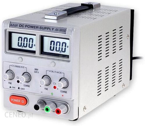 Zasilacz Axiomet AX-3005D to jednokanałowy stabilizowany zasilacz laboratoryjny z regulacją napięcia od 0 do 30 V oraz prądu od 0 do 5 A. Posiada dobrą stabilizację prądową i napięciową. Jest lekki i wydajny, nadaje się zarówno do serwisów jak i do laboratoriów.Właściwości:2 wyświetlacze LCD 2 x 3,5 cyfrypłynna regulacja napięcia i prąduzabezpieczenie przeciwzwarcioweogranicznik prądowyzabezpieczenie przed przyłączeniem do wyjścia zasilacza napięcia o przeciwnej polaryzacjijednoczesny odczyt napięcia i prądu wyjściowegobardzo dobry współczynnik regulacji prądowej i napięciowejDane techniczne:Wyświetlacz: 2 x 3,5 cyfry LCDNapięcie wyjściowe DC0-30 VPrąd wyjściowy: DC 0-5 AStabilizacja napięcia: ≤0,01% ± 1 mVStabilizacja prądu: ≤0,2% ± 1 mATętnienia i szumy: ≤1 mVrmsZasilanie: 230 V AC ± 10%Wymiary: 291 x 158 x 136 mmMasa około: 6 kgart. ZAS-3003D